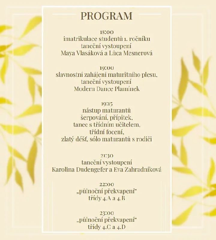 Už se to blíží! V neděli 15. února se ve Foru Karlín koná maturitní ples Karlínské obchodní akademie. Večer zahájíme imatrikulací prvních ročníků, bude následovat slavnostní nástup a šerpování čtvrtých ročníků. Večerem bude provázet Vítek Havliš a k tanci nám zahraje kapela Brand New Band. Dveře hlavního vchodu se pro veřejnost otevřou v 17:15. Lístky na stání bude možné zakoupit na místě bezhotovostně pomocí QR kódu, cena je 400 Kč. Těšíme se na vás!