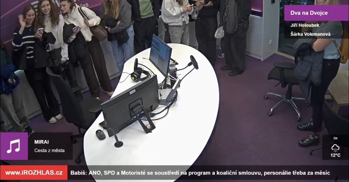 Studenti a studentky mediálního semináře navštívili 14. 10. 2025 Český rozhlas. Dozvěděli se o jeho důležité historii, prohlédli si budovu i vysílací studio. A na chvilku se navíc stali hvězdami online vysílání. Děkujeme za poslech pořadu Blízká setkání s moderátorkou Terezou Kostkovou a hostem Petrou Nesvačilovou.