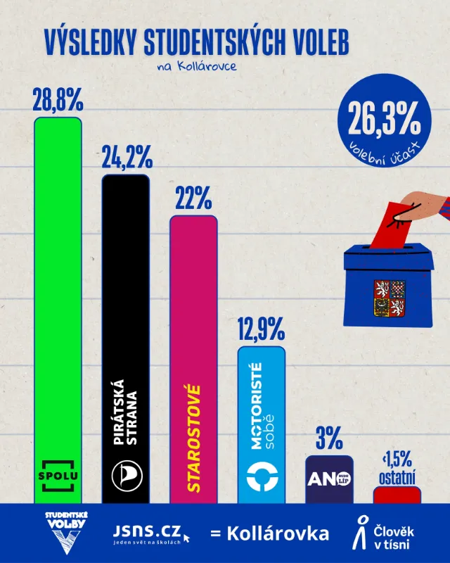 Na Kollárovce se letos opět volilo, studentských voleb do Poslanecké sněmovny se zúčastnilo 132 žáků (26,3%), kteří jednoznačně vyslovili podporu současné vládní koalici skládající se ze SPOLU, Pirátů a Starostů. Do Poslanecké sněmovny by ještě pustili Motoristy sobě, ze čtvrtého místa, zatímco páté hnutí ANO skončilo pod povinnou 5% hranicí. V celostátních volbách se výsledek oproti tomu našemu karlínskému v prvních příčkách nelišil, koalice SPOLU zvítězila s více než 20 %. Děkuji všem, kteří svůj hlas využili, a přeji zletilým studentkám a studentům šťastnou ruku 3. a 4. října v reálných volbách. Daniel Krauz, 4.D.